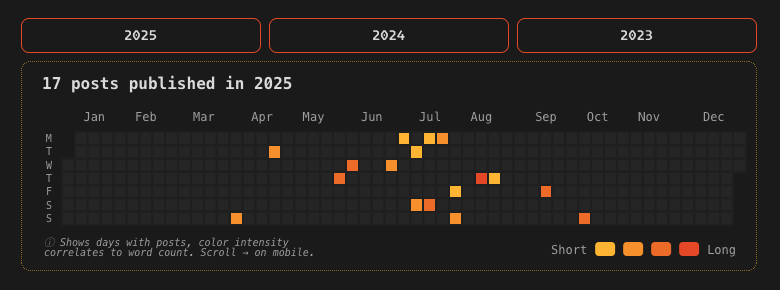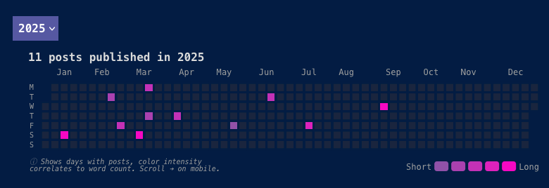 Here are some looks you can achieve with Hugo Calendar Heatmap. More examples will be added soon; a user submission system is on the roadmap so you can share your designs with others.BurgeonLab# Vaporwave# GitHub#coming soon